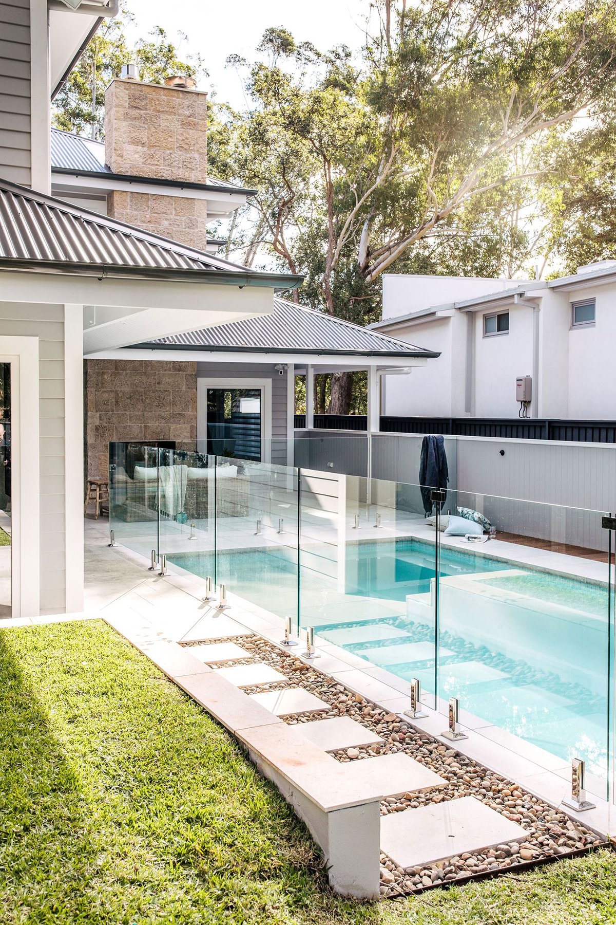 A light waterline tile, white pebble interior, and natural stone coping were carefully selected to complement the home’s palette while creating a gentle contrast with the surrounding bushland.