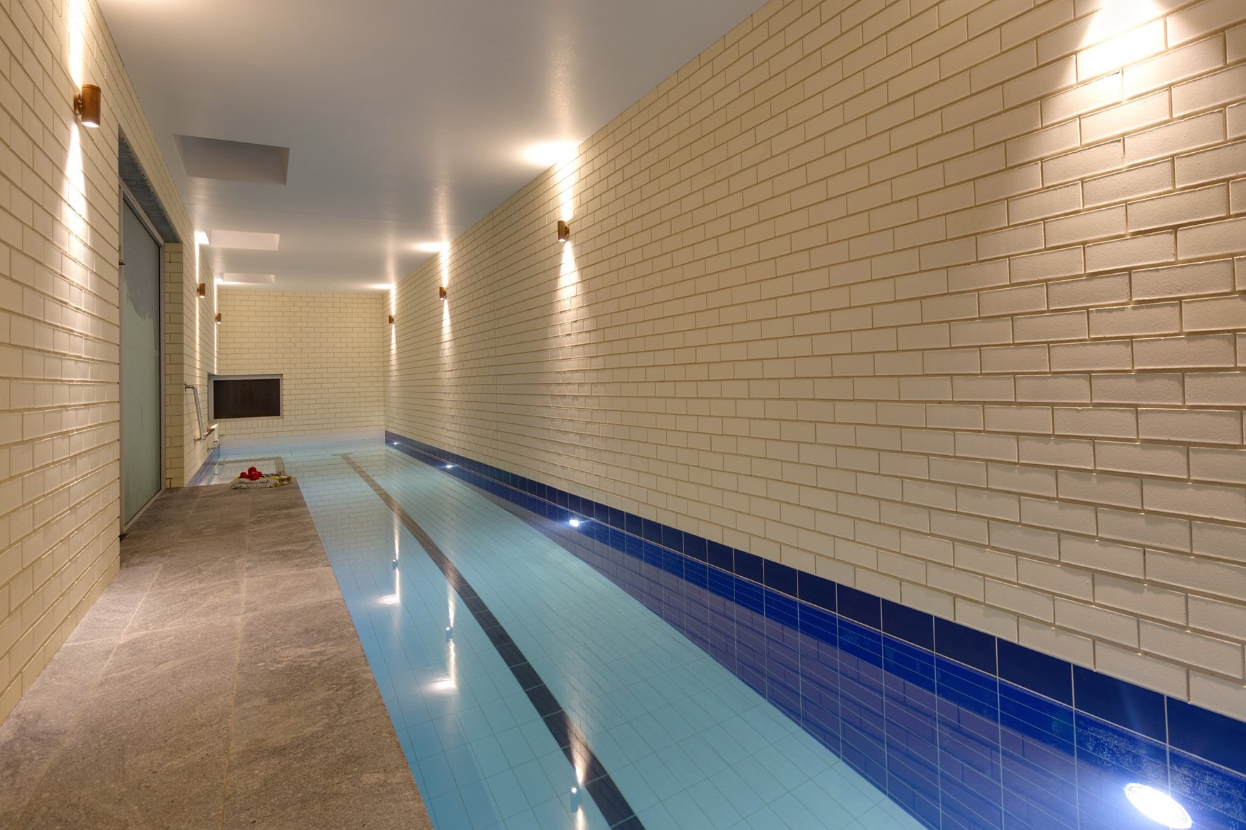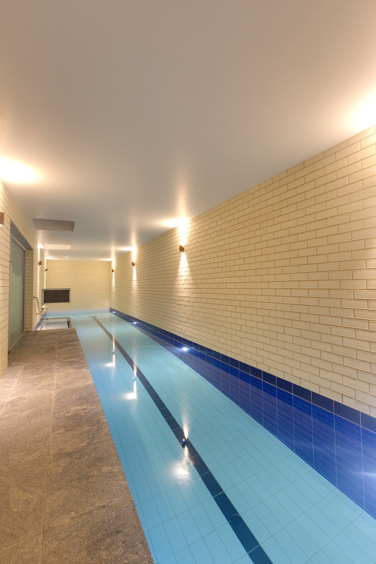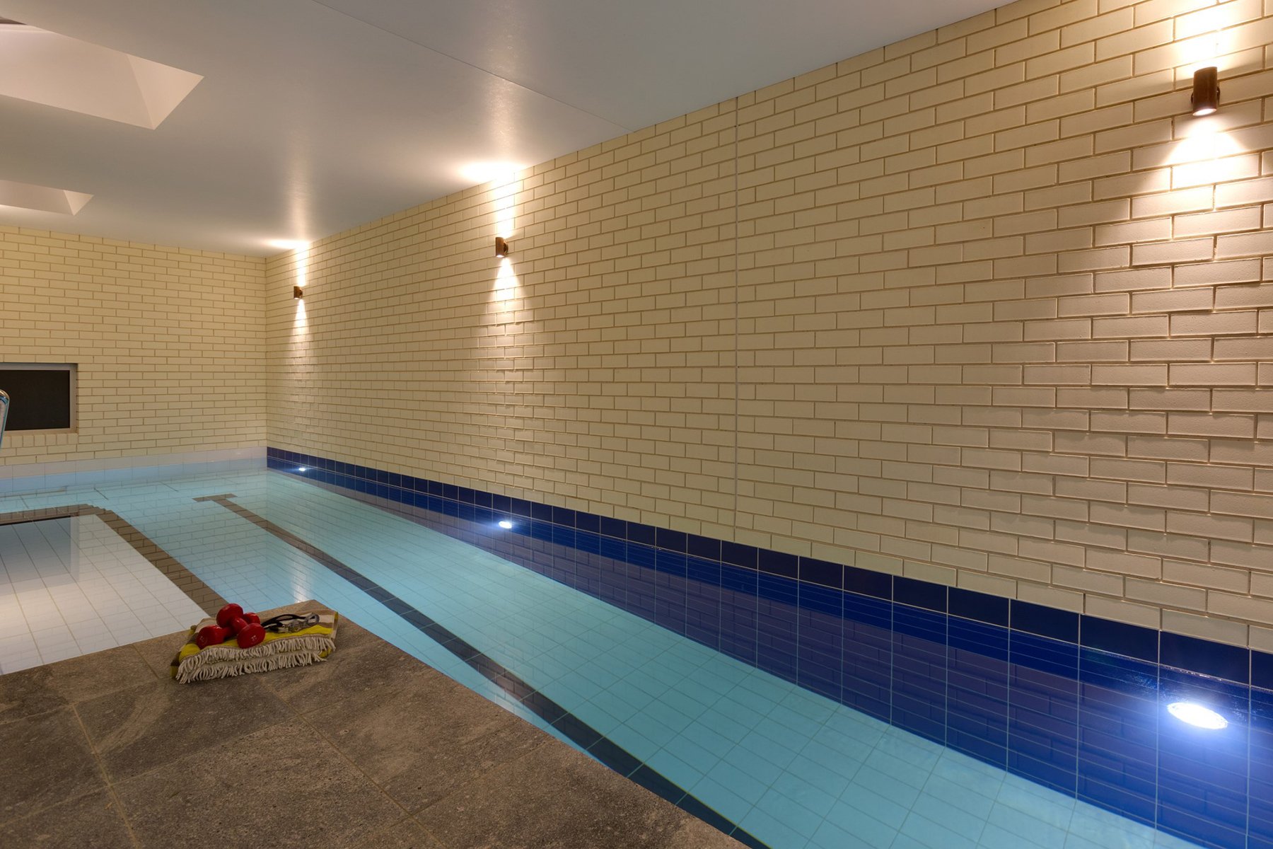 This is an excellent example of an indoor pool designed for year-round hydrotherapy, unaffected by the weather. Handrails and contrasting step-edge tiles provide the essential safety features required by the client.