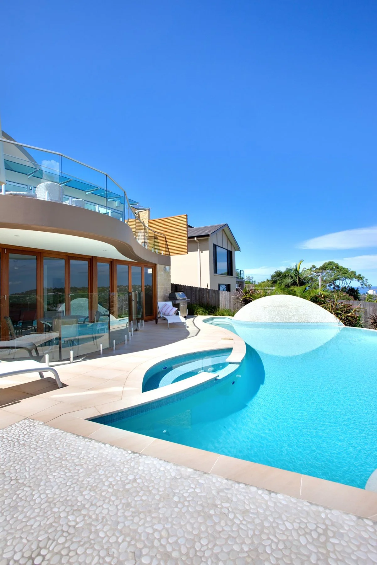 The beauty of concrete pools is that they can be shaped however you like. Here, the pool mirrors the curves of the balcony, enhancing the sense of tranquility and calm. The pebble interior complements the pebble feature wall and paving, while the spa is tiled with the same glass mosaic used along the waterline, creating a stunning light blue hue.